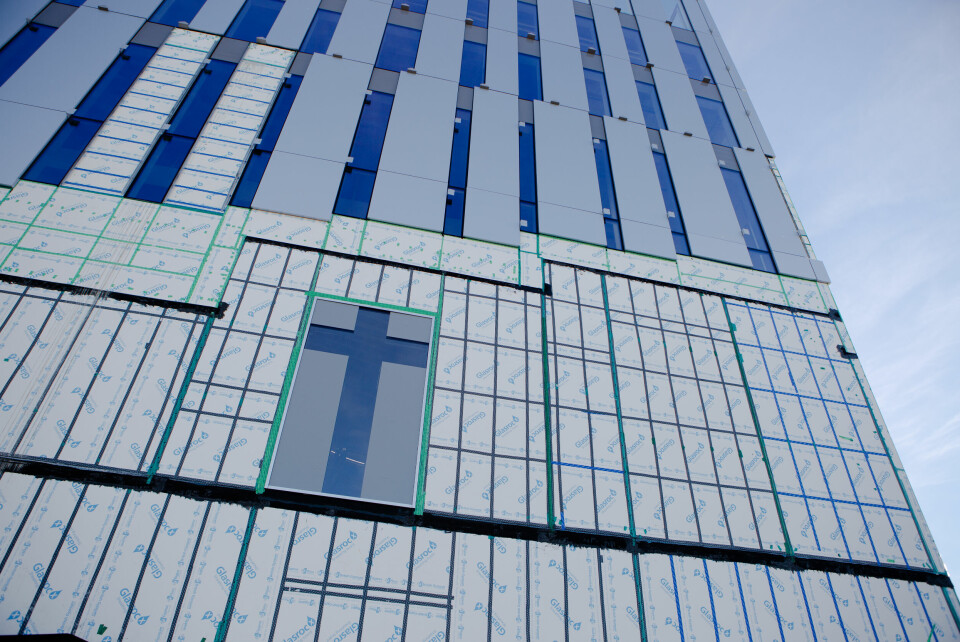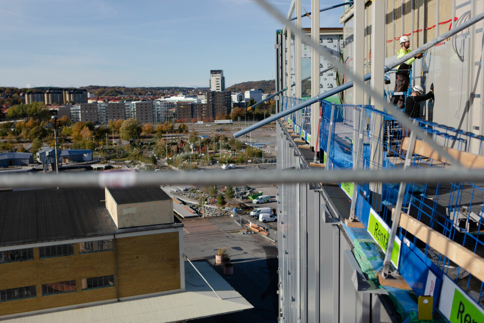 När vi står på bilparkeringen och betraktar det hela lite på distans råder tystnad. Det enda som hörs är vinden som blåser, bygghissen som skrapande kryper längs fasaden och byggarbetarna som håller på att fästa fasadelement och isolering på kyrkans ytterväggar.