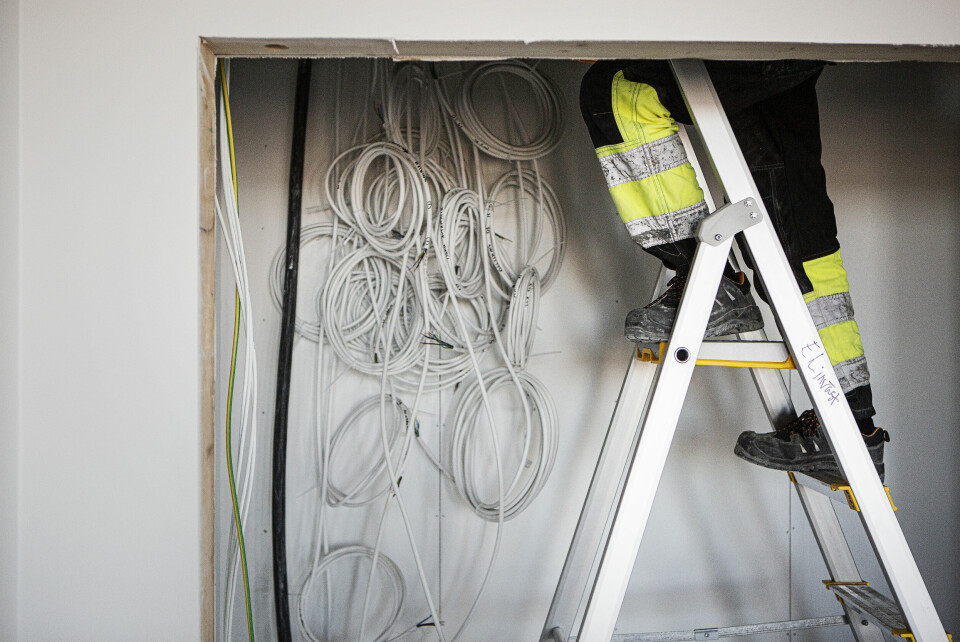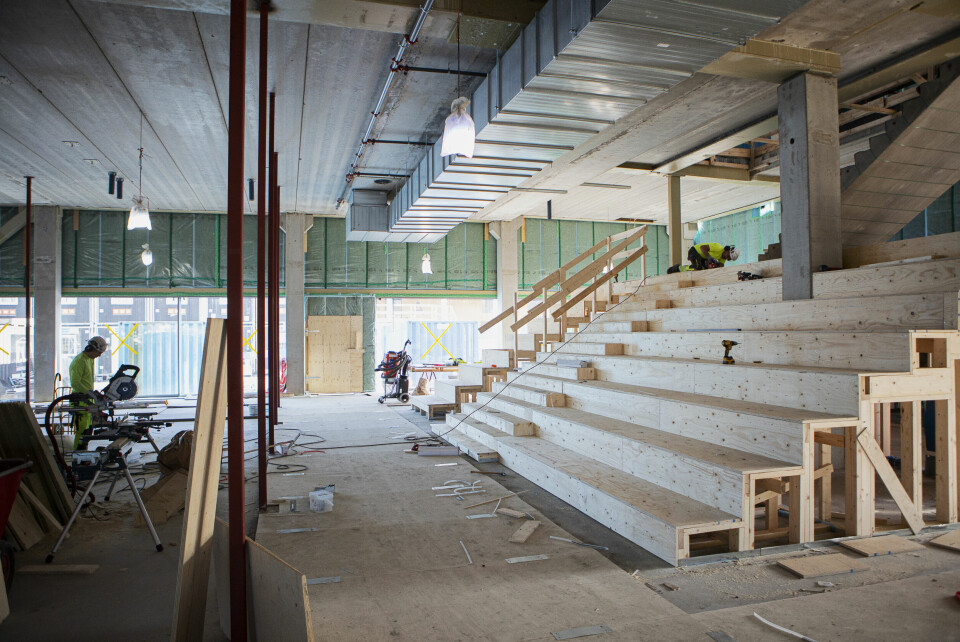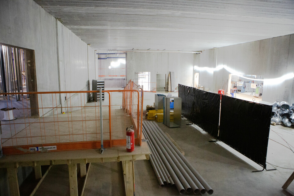Väl inne i byggnaden pågår arbetet med full kraft. Likt viga katter utför byggarbetarna – enligt Kjell Bramwall rör det sig om ett 70-tal personer dagligen – sina olika uppgifter. Ofta flera meter upp i luften på en stege eller byggställning. Med små åthävor och stor precision utför de sitt viktiga arbete.