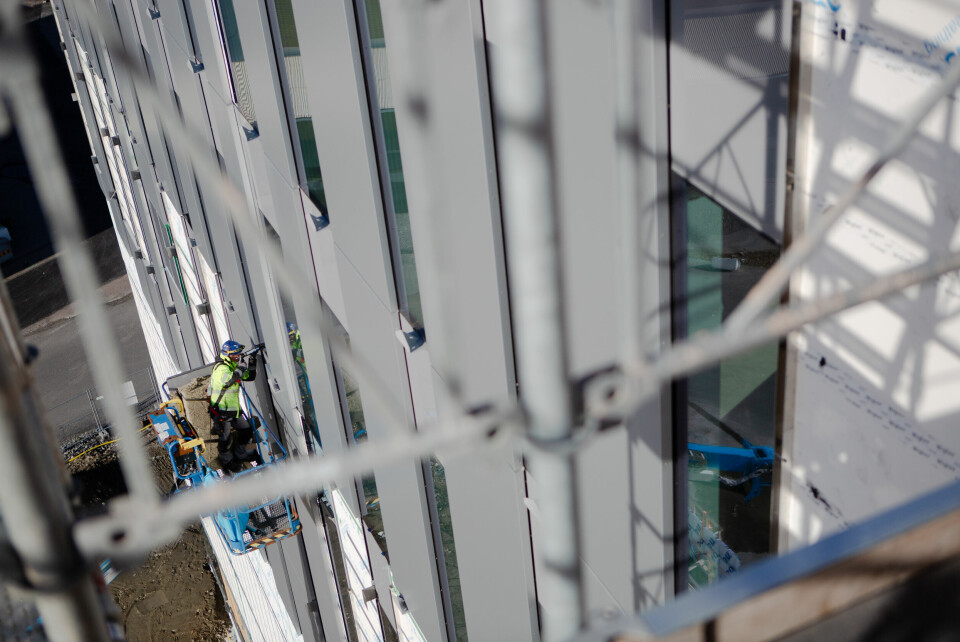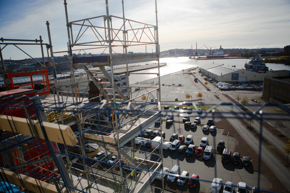 Vid själva byggarbetsplatsen, som omgärdas av stängsel, pågår arbetet för fullt. Över alltihop sträcker sig en byggkran upp mot skyn. Likt en hök vakar den över hela byggprojektet och skänker platsen ett visst lugn.