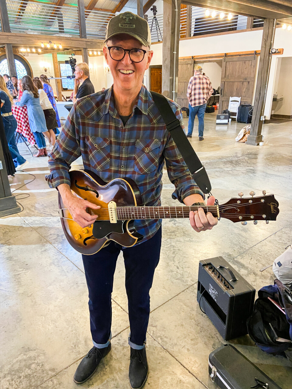 Bengt Johansson blev så här glad när han fick känna på den Guild-gitarr som Evie Tornquist Karlssons föräldrar för länge sedan köpte i New York av den norske sångarevangelisten Aage Samuelsen.