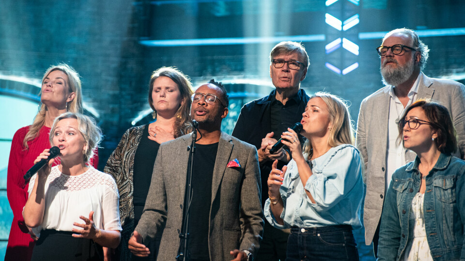 Artisterna körar åt sig själva. I förgrunden de norska systrarna Aina Økland Schøld och Merete Økland Espedal som flankerar den i Sverige så välkände Putte Nelsson.