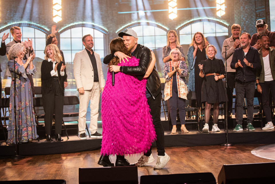 Michael Jeff Johnson från en stor kram av Maria Gustin Bergström efter hans känslosamma framförande av sången "Stormens överman".