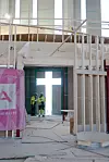 Än så länge består kyrkan av ett skal. Fönster, ytter- och innerväggar är på plats, men i övrigt finns inte mycket som avslöjar hur den kommer att se ut när den är klar. Schakten, där hissar ska binda samman de olika våningsplanen med varandra, gapar tomma.