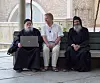 Samuel Rubenson när han diskuterar digitala verktyg med två munkar i Makariosklostret i Egypten.