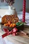 Julkryddad crème brûlée med knäckigt flarn och saffranskokta hjortron