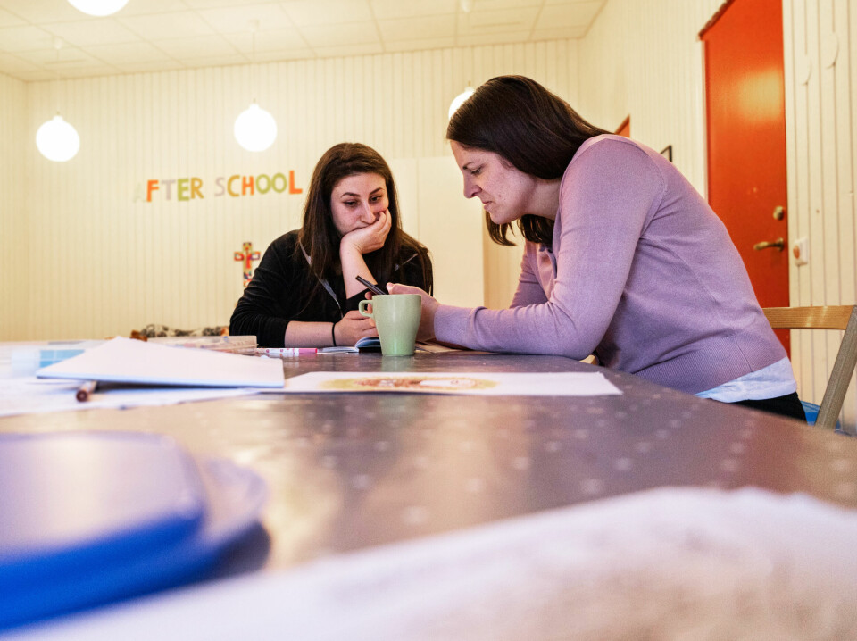Det är lek och stoj i bakgrunden samtidigt som hon läser högt i en bok som visar sig vara alldeles för enkel för henne. Hon sitter också småpratar med Haddas från Eritrea som med stolthet berättar att hon dagen efter ska göra sin första praktikdag, på församlingens förskola Vingen.