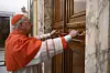 Kardinal Camerlengo Kevin Joseph Farrell förseglar dörren till det påvliga sovrummet och studion i Vatikanen efter tillkännagivandet av påven Franciskus död under måndagen.