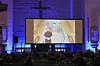 Petja Kopperoinen är den präst som ligger bakom experimentet med en AI-gudstjänst och här syns han själv på storbildsskärmen återskapad digitalt med hjälp av AI.