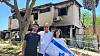 Göran Duveskog på sin senaste resa till Israel, i maj i år. Han står mellan två israeliska vänner vid ett utbrunnet hus i kibbutzen Kissufim, som attackerades av Hamas den 7 oktober 2023.