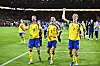 Sveriges Benjamin Nygren, Gustaf Lagerbielke och Lucas Bergvall tackar publiken efter 3–2-vinsten i playoff-finalen mellan Sverige och Polen på Strawberry Arena.