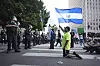En man med en flagga från El Salvador protesterar mot myndigheternas räder mot migranter i Los Angeles, framför en grupp poliser.