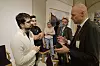 Den iranske konvertiten Sina Vafa, 22, i samtal med Migrationsverkets rättschef Carl Bexelius efter ett seminarium i riksdagen. Bakom dem från vänster det iranska paret Milad Motammedi Esmaili och Monireh Masn Abadi, också de konvertiter, samt riksdagsledamot Yusuf Aydin (KD), som stod som värd för mötet.