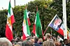 Polisuppbackningen var omfattande kring Norrmalmstorg i samband med manifestationen på årsdagen av Hamas blodiga terrordåd i Israel då över 1 400 civila mördades och runt 250 människor togs som gisslan. Såväl helikopter som drönare syntes vaka över de församlade. I folkhavet vajar några israeliska flaggor, men även ett antal iranska av den oppositionella varianten. Den så kallade persiska flaggan som symboliserar motstånd mot det islamistiska styret. Människor höjer sina fanor och vajar dem i luften.