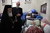 Den grekisk-ortodoxa patriarken av Jerusalem, Theophilos III, och den latinske patriarken Pierbattista Pizzaballa besöker en kvinna som skadades när israelisk eld träffade den katolska kyrkan i Gaza stad i juli. Premiärminister Netanyahu beklagade det inträffade och menade att kyrkan hade träffats av misstag.