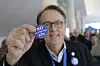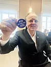 Han tryckte också kaxigt upp en knapp med texten ”KD på väg mot 12 procent” som han sedan bar på sin egen kavaj.