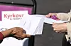 Valkuvert delas ut till röstande utanför lokalen för förtidsröstning i kyrkovalet 2021 vid S:t Johannes kyrka vid Triangeln i Malmö.