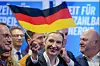 Alice Weidel, ledare för Alternativ för Tyskland (AfD), firar valresultatet med en tysk flagga i handen.